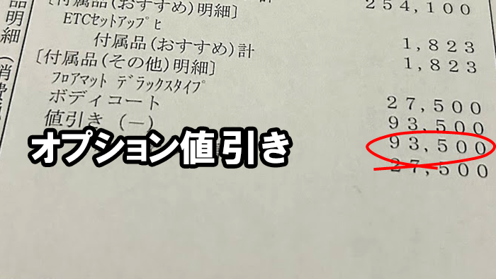 - 本体からの値引きが少ないですね。オプション値引きはディーラーオプションの総額が15万円以下であれば合格ラインです。
